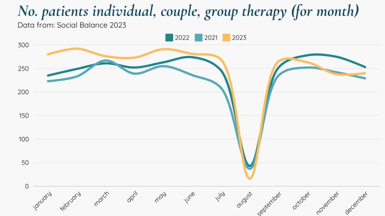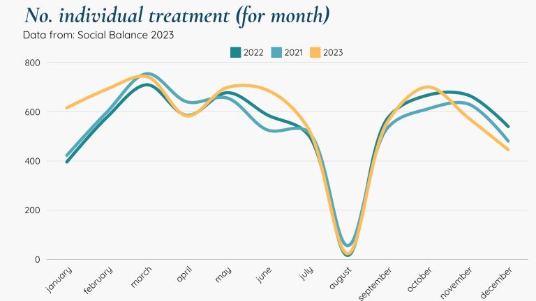 The data collected in 2023 shows that on average around 600 individual treatments were carried out every month and the number of patients who underwent psychotherapy (individual, couple or group) was close to 300 people every month.